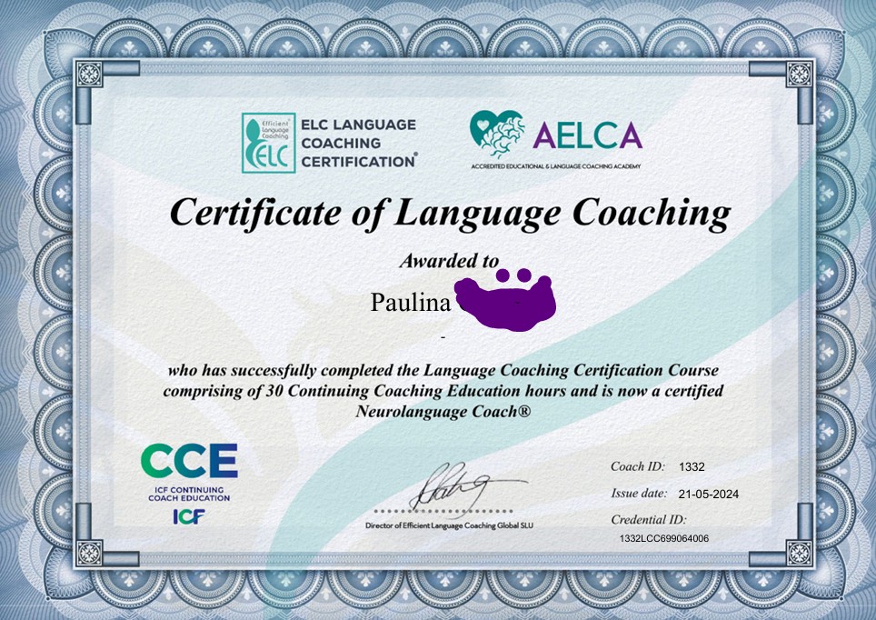 Jestem tzw. Projektorem 2/4 (Human Design) i pracuje mi się najlepiej w trybie 1:1, ponieważ mogę dobrze wczuć się w potrzeby osoby, z którą pracuję. Uczyć j. niemieckiego zaczęłam przez przypadek, kiedy obowiązki zawodowe przestały być dla mnie pasjonujące. Zauważyłam, że uczenie języka bardzo mnie spełnia, ponieważ lubię pracować blisko z osobami i wspierać ich rozwój. Kocham tę pracę, ze względu na możliwość rozwijania mojego systemu nauczania i umiejętności poznawania problemów i blokad moich klientów. Przez szkolenie u Rachel Paling (Neurolanguage Coaching) doszlifowałam umiejętności coachingowi i przedstawianie języka w sposób nowoczesny i miły dla mózgu.